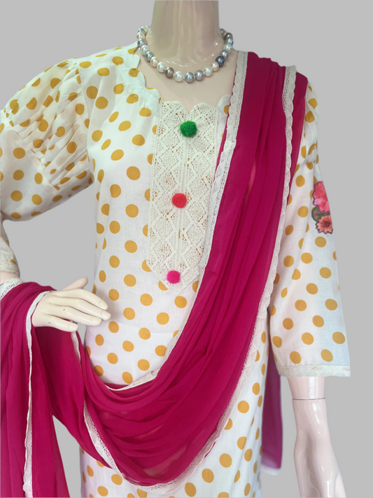 Cotton Cream With Yellow Stitched Suit / Polka Petals