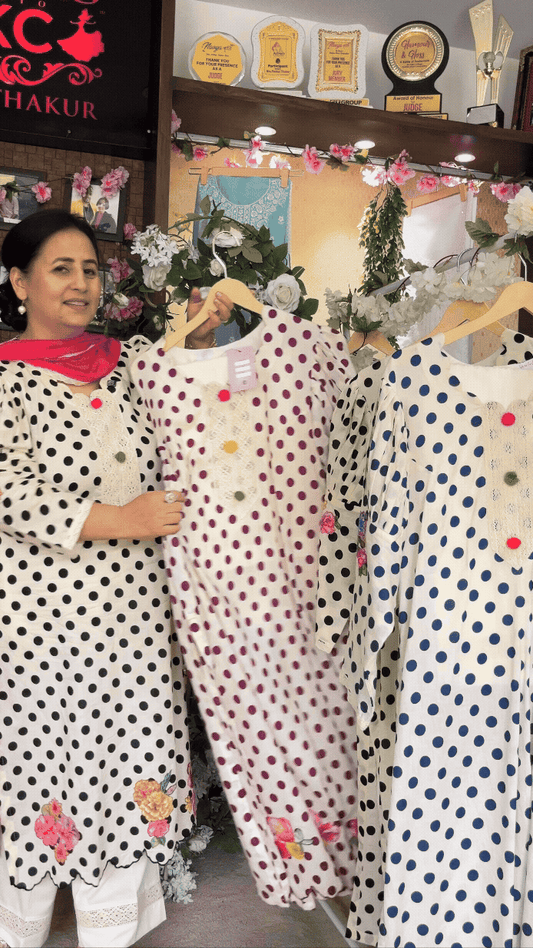 Cotton Cream With Navy Blue Stitched Suit / Polka Petals