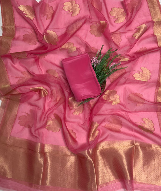 Georgette Banarasi Carrot Pink Suit Fabric / Banarasi Baithak
