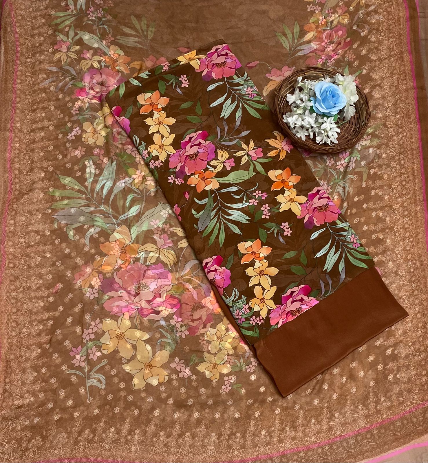 चिनॉन क्रेप ग्रे सूट फैब्रिक / फूलों का घर