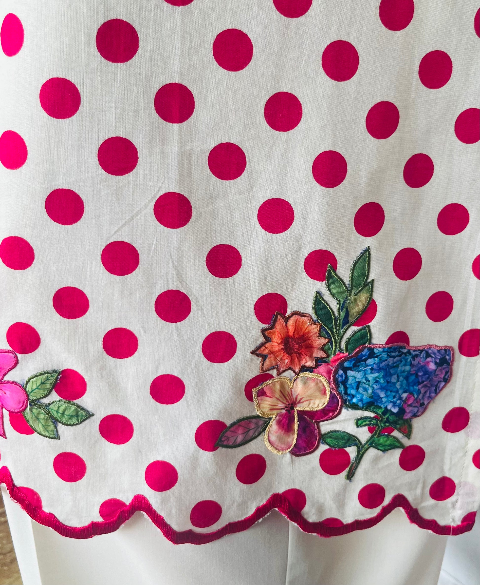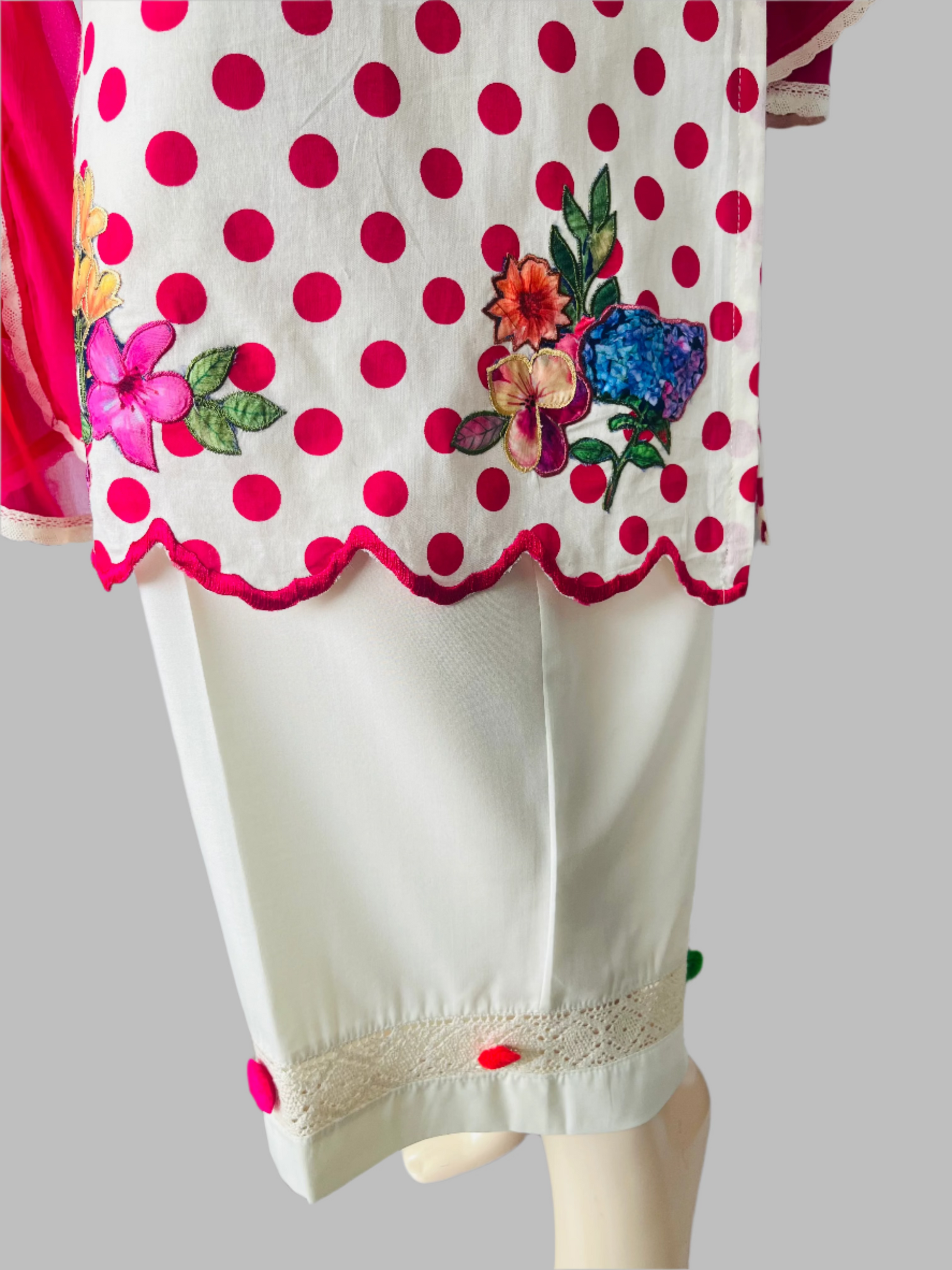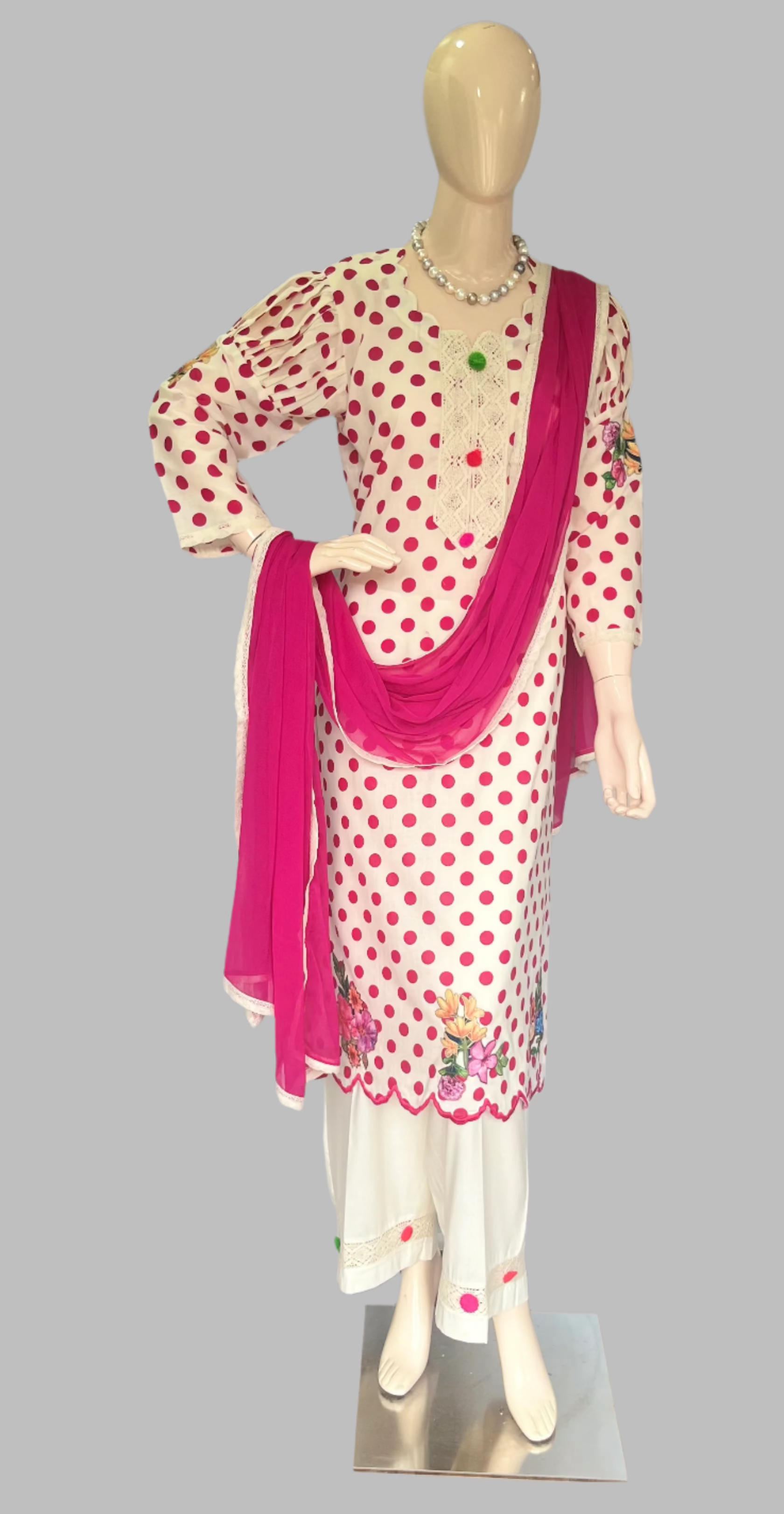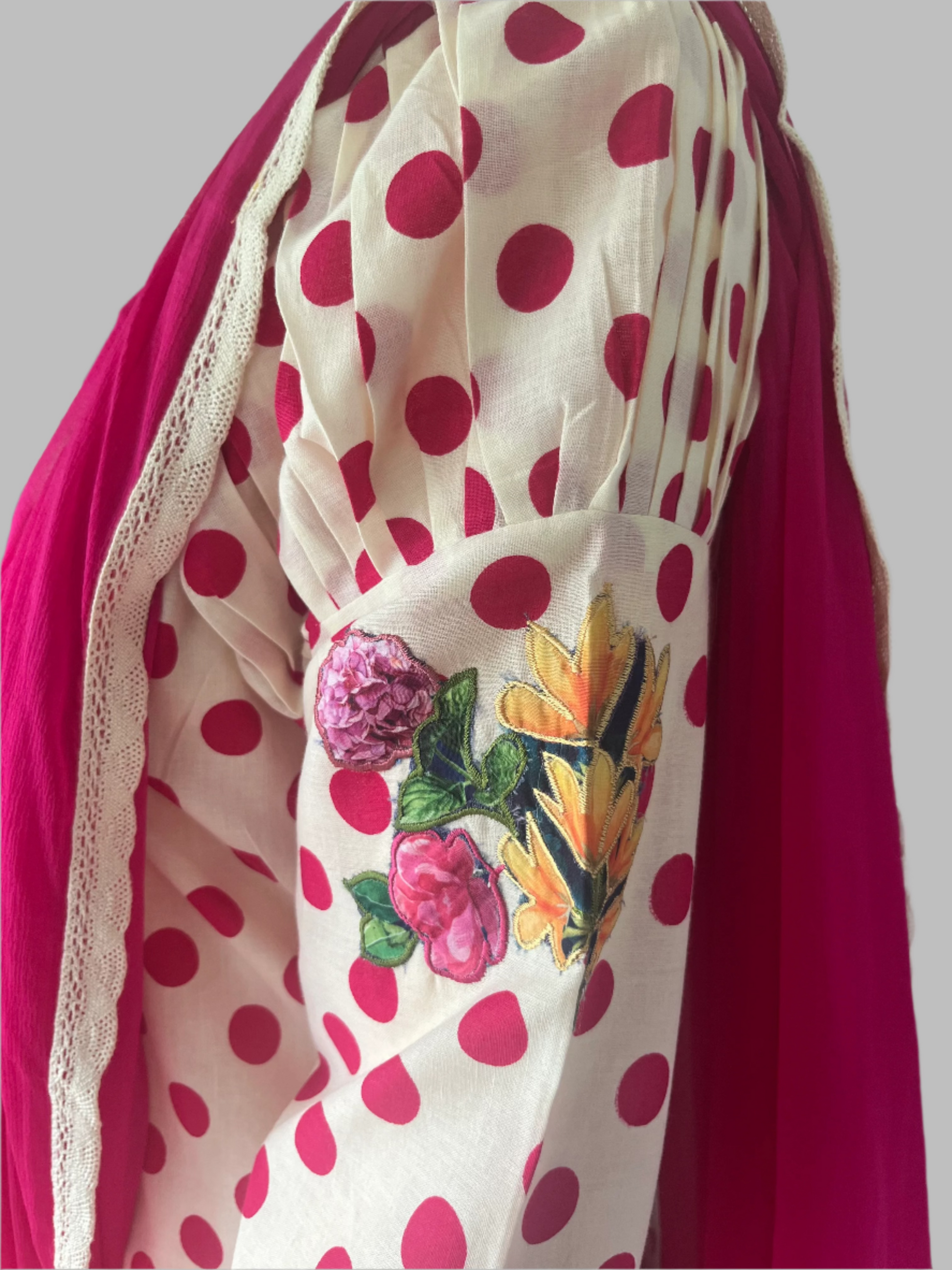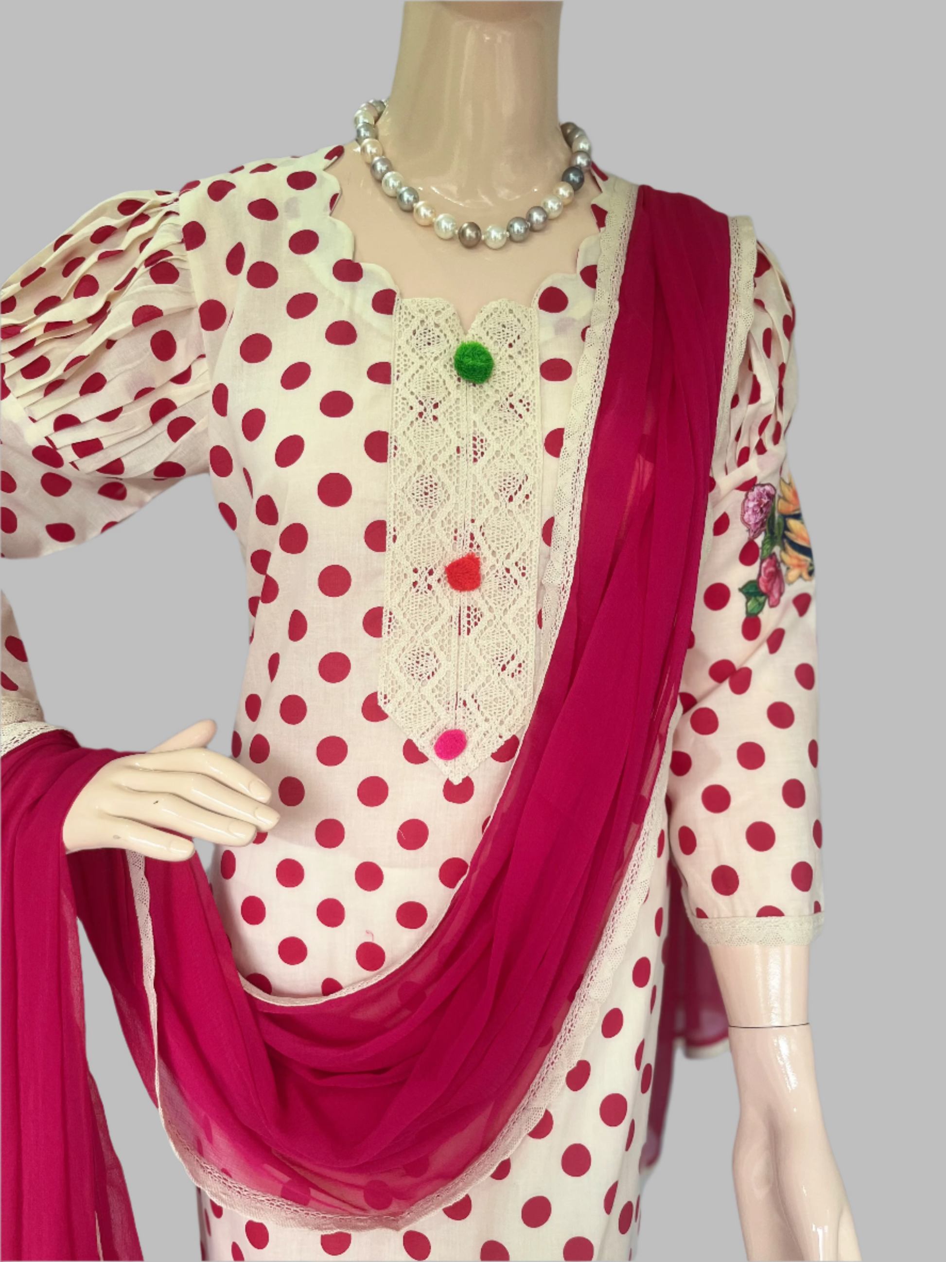 Cotton Cream With Majenta Stitched Suit / Polka Petals