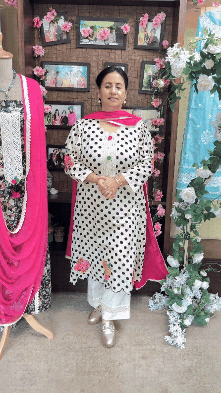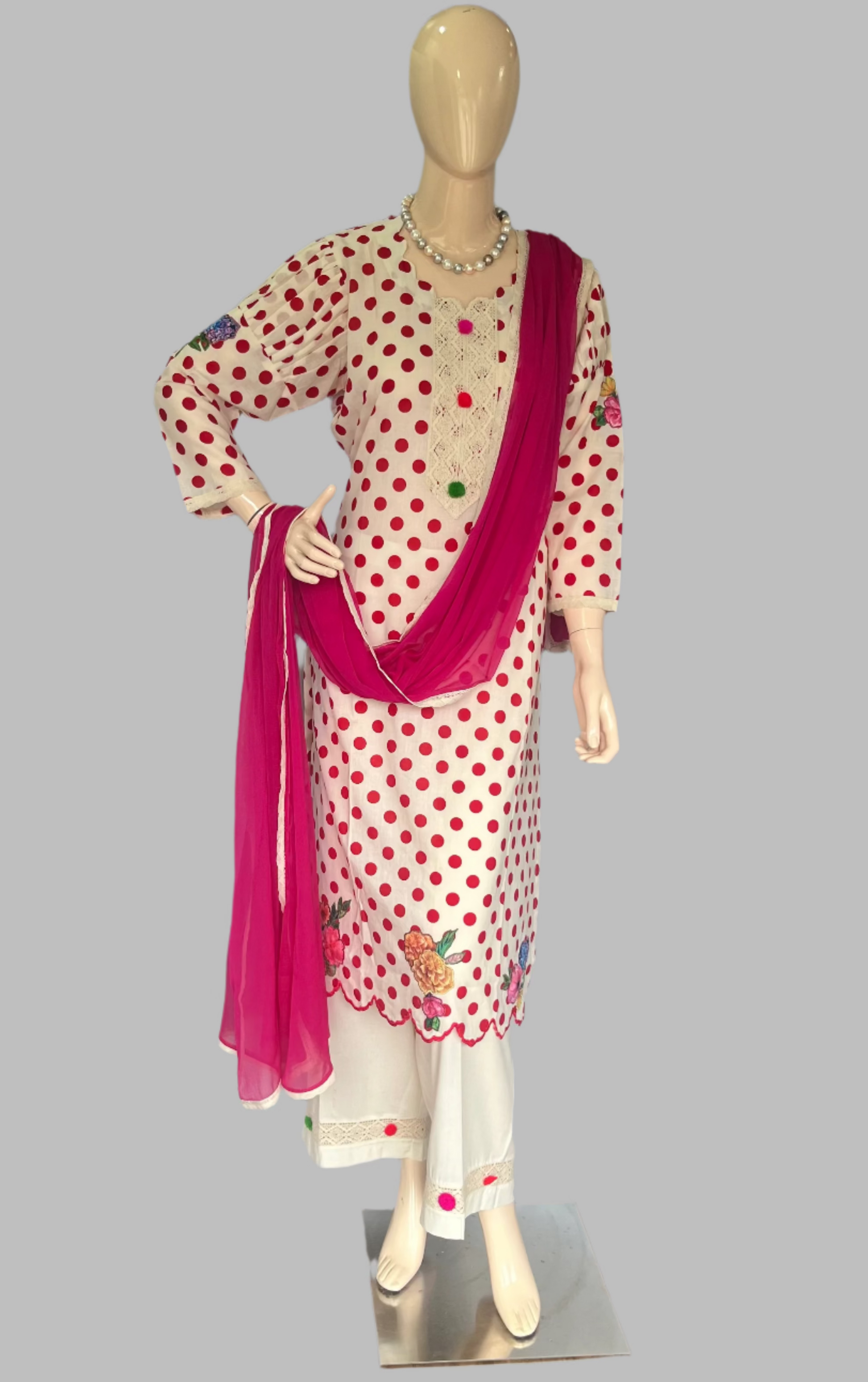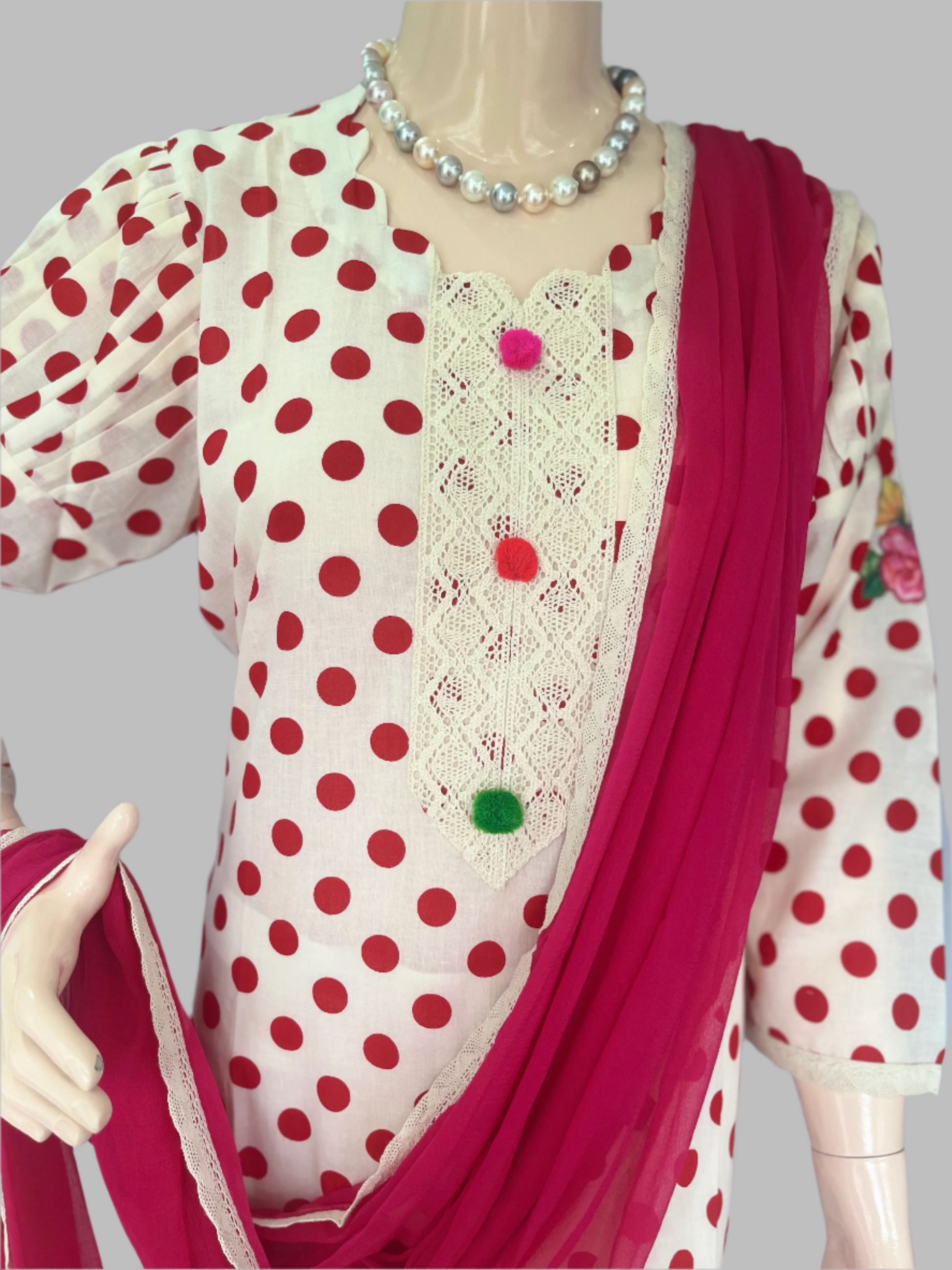 Cotton Cream With Red Stitched Suit / Polka Petals