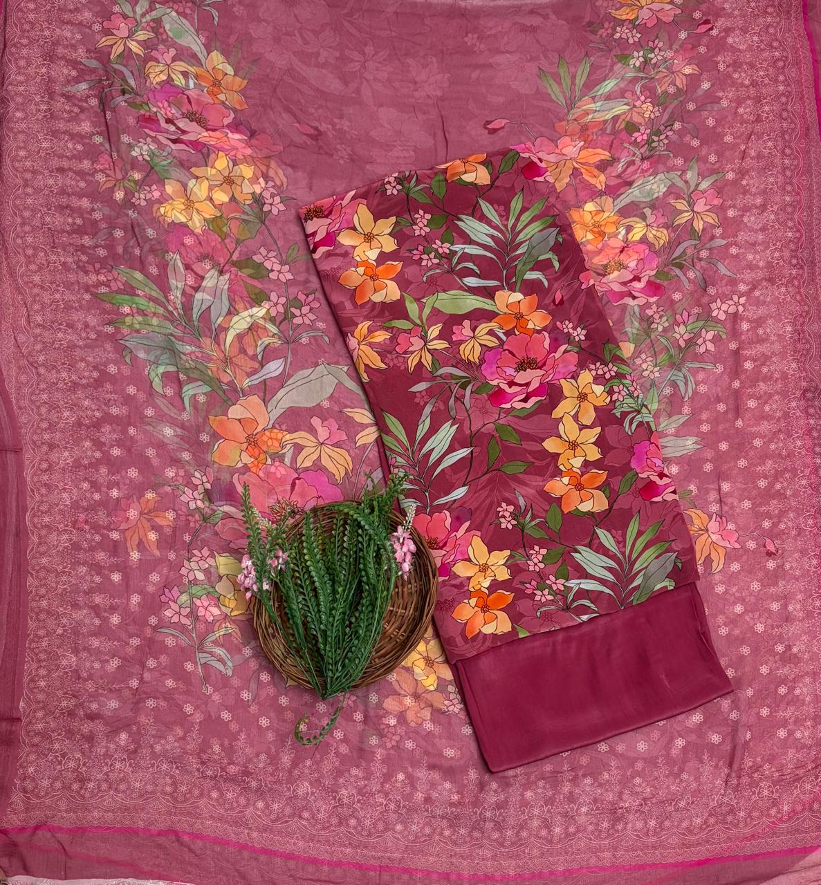 Crepe Burgundy Pink Suit Fabric / Phoolon Ka Ghar